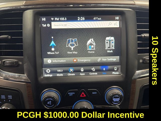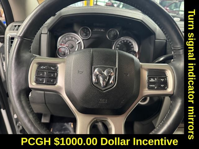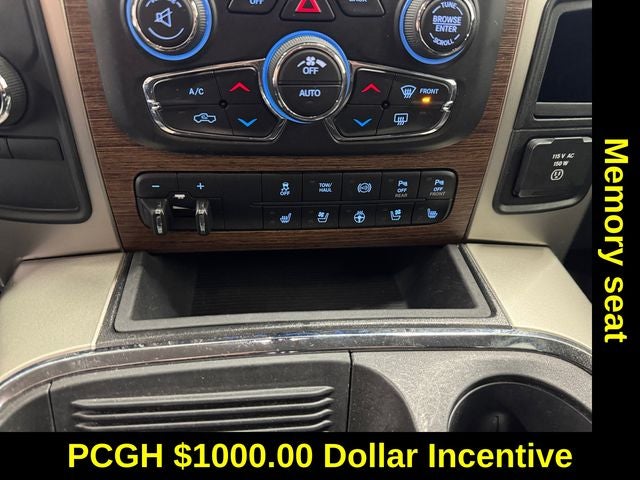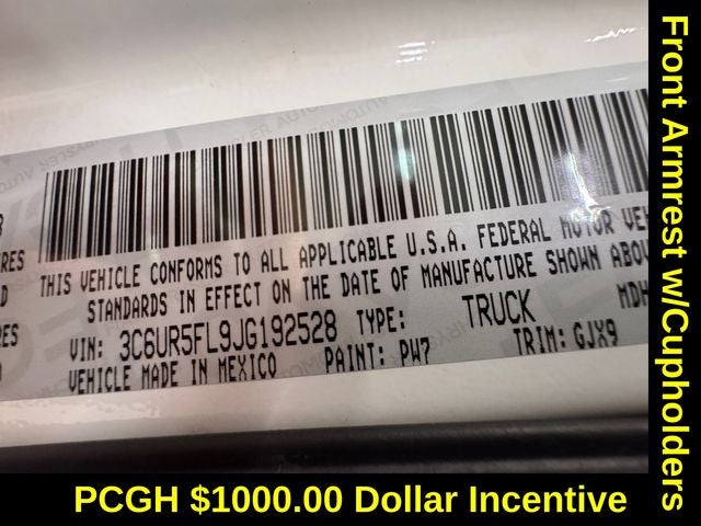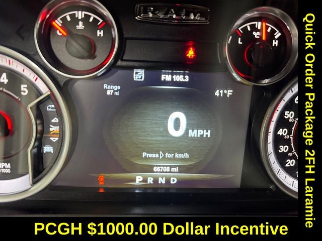 Protection Group, Quick Order Package 2FH Laramie (Front Armrest w/Cupholders), 1-Year SiriusXM Guardian Trial, 10 Speakers, 5-Year SiriusXM Traffic Service, 5-Year SiriusXM Travel Link Service, 8.4 Touchscreen Display, Audio memory, GPS Antenna Input, GPS Navigation, HD Radio, Heated Front Seats, Heated front seats, Heated steering wheel, Integrated Center Stack Radio, Integrated Voice Command w/Bluetooth®, Media Hub (2 USB, AUX), Memory seat, ParkView Rear Back-Up Camera, Power driver seat, Power Folding Mirrors, Radio: Uconnect 4C Nav w/8.4 Display, Radio: Uconnect 4C w/8.4 Display, SiriusXM Satellite Radio, SiriusXM Traffic Plus, SiriusXM Travel Link, Steering wheel mounted audio controls, Turn signal indicator mirrors, 115V Auxiliary Power Outlet, 4-Wheel Disc Brakes, 40/20/40 Split Bench Seat, ABS brakes, Air Conditioning, Alloy wheels, AM/FM radio: SiriusXM, Apple CarPlay/Android Auto, Auto-dimming door mirrors, Auto-dimming Rear-View mirror, Automatic temperature control, Black Exterior Mirrors, Brake assist, Bumpers: chrome, Chrome Exterior Mirrors, Compass, CTR Stop Lamp w/Cargo View Camera, Delay-off headlights, Driver door bin, Driver vanity mirror, Dual front impact airbags, Dual front side impact airbags, Electronic Stability Control, Emergency communication system: SiriusXM Guardian, Exterior Mirrors Courtesy Lamps, Exterior Mirrors w/Memory, Exterior Mirrors w/Supplemental Signals, Front anti-roll bar, Front Center Armrest w/Storage, Front dual zone A/C, Front fog lights, Front reading lights, Fully automatic headlights, Garage door transmitter, Heated door mirrors, Illuminated entry, Keyless Enter-N-Go, Leather steering wheel, Leather Trim 40/20/40 Bench Seat, LED Bed Lighting, Low tire pressure warning, Manufacturer's Statement of Origin, Occupant sensing airbag, Outside temperature display, Overhead airbag, Overhead console, Panic alarm, Passenger door bin, Passenger vanity mirror, Power door mirrors, Power Folding Chrome Trailer Tow Mirrors, Power passenger seat, Power steering, Power windows, Radio data system, Rear seat center armrest, Rear step bumper, Remote keyless entry, Remote Proximity Keyless Entry, Remote Start System, Security system, Speed control, Split folding rear seat, Tachometer, Tilt steering wheel, Traction control, Trailer Tow Mirrors, Trip computer, Variably intermittent wipers, Vendor Painted Cargo Box Tracking, Ventilated front seats, Voltmeter, and Wheels: 18 x 8.0 Polished Aluminum.