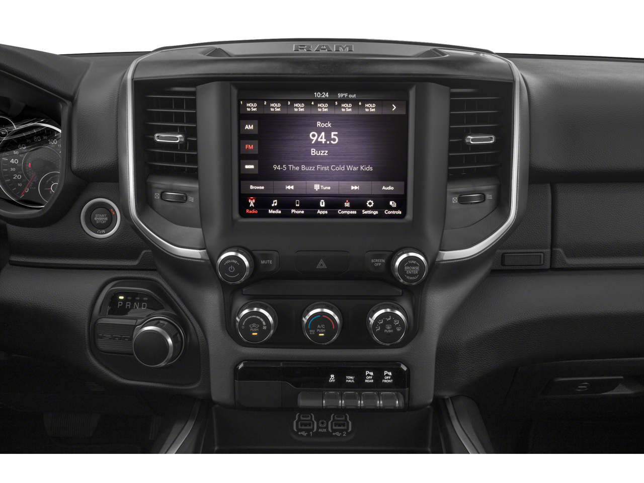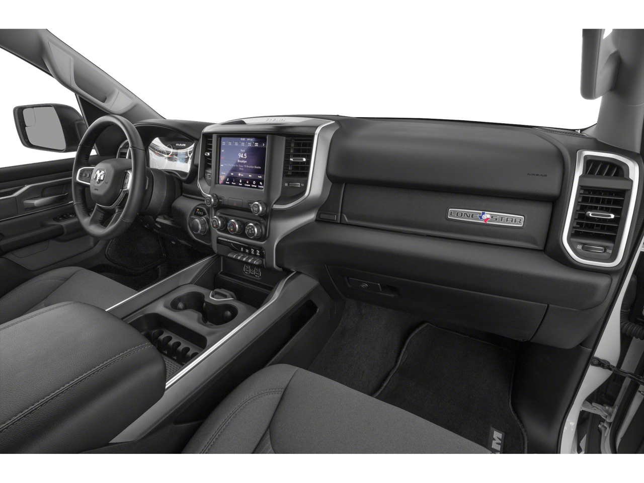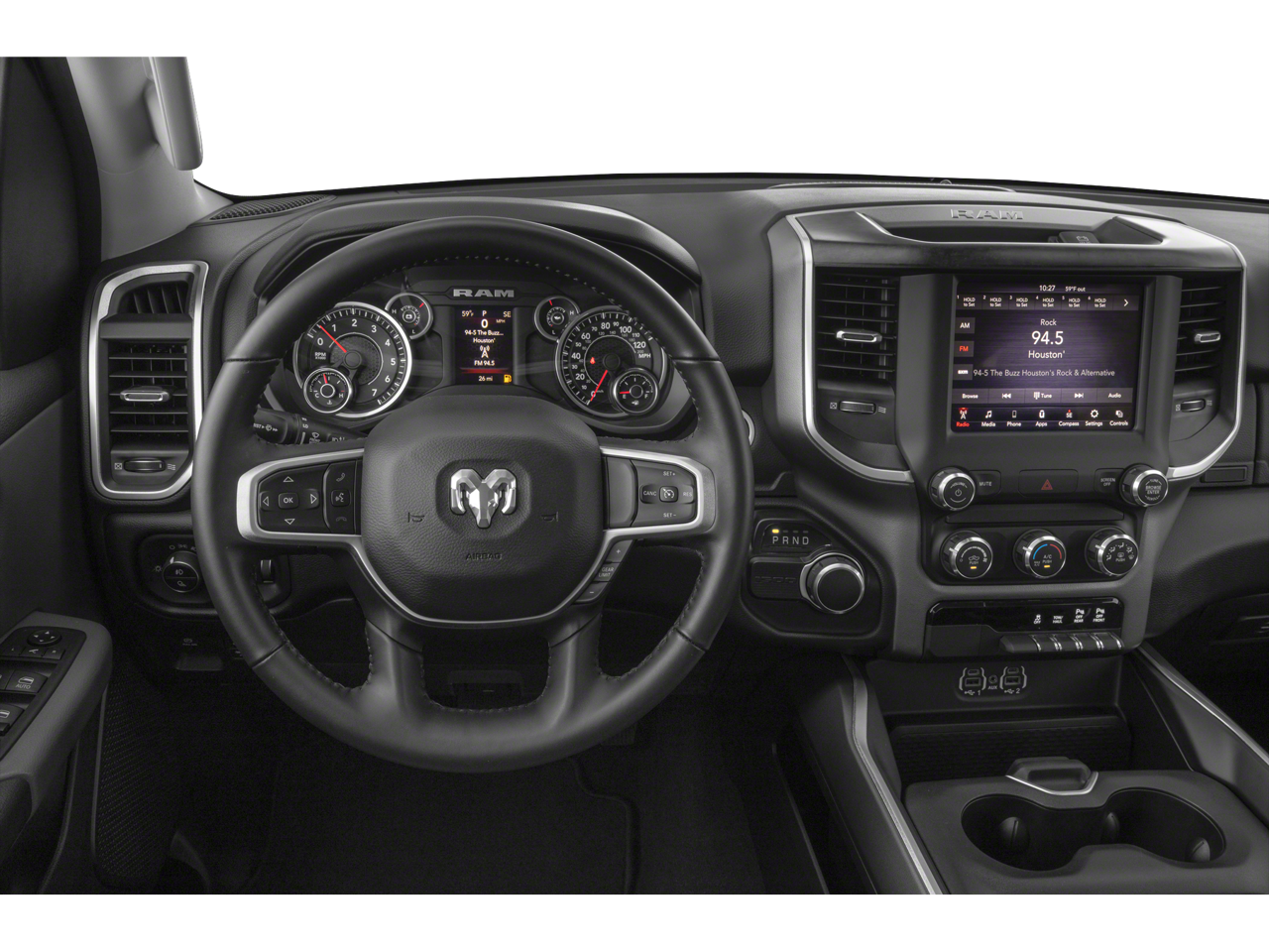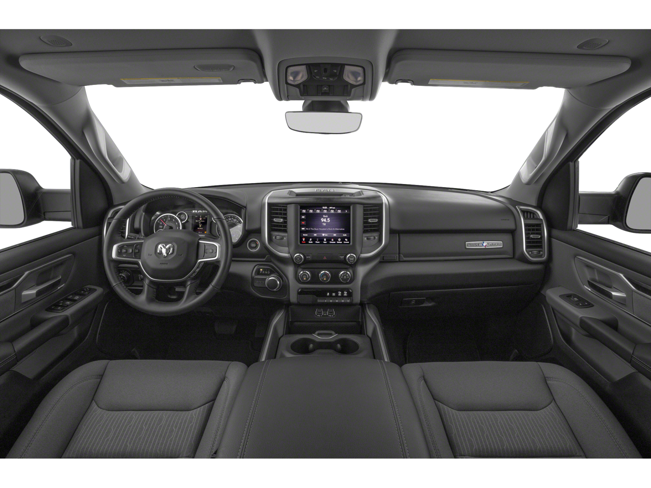 Big Horn Level 2 Equipment Group (115V Auxiliary Power Outlet, 115V Auxiliary Rear Power Outlet, 2 USB Full Function/Charge Only Media Hub, 2nd Row In Floor Storage Bins, 400W Inverter, Air Conditioning ATC w/Dual Zone Control, Auto-Dimming Rear-View Mirror, Big Horn IP Badge, Black Premium Power Mirrors, Class IV Receiver Hitch, Dampened Tailgate, Foam Bottle Insert (Door Trim Panel), Glove Box Lamp, Heated Front Seats, Heated Steering Wheel, ParkSense Front/Rear Park Assist w/Stop, Power 4-Way Driver Lumbar Adjust, Power 8-Way Driver Seat, Power Adjustable Pedals, Radio: Uconnect 4 w/8.4 Display, Rear Dome w/On/Off Switch Lamp, Rear Power Sliding Window, Rear Window Defroster, Security Alarm, SiriusXM Satellite Radio, Sun Visors w/Illuminated Vanity Mirrors, and Universal Garage Door Opener), Night Edition (3 Rear Seat Head Restraints, 4 Way Front Headrests, Anti-Spin Differential Rear Axle, Auto-Dimming Exterior Driver Mirror, Black Exterior Truck Badging, Black Headlamp Bezels, Black Interior Accents, Body Color Door Handles, Body Color Exterior Mirrors, Body Color Front Bumper, Body Color Premium Power Mirrors, Body Color Rear Bumper w/Step Pads, Bucket Seats, Deluxe Cloth Bucket Seats, Dual Exhaust w/Black Tips, Exterior Mirrors Courtesy Lamps, Exterior Mirrors w/Memory, Front Seat Back Map Pockets, Full Length Floor Console, Grille Surround 1 Black Texture 2 Black, Manual Adjust 4-Way Front Passenger Seat, Power-Folding Mirrors, Rear 60/40 Folding Seat, and Wheels: 20 x 9.0 Premium Paint/Polished), Premium Lighting Group (Front LED Fog Lamps, LED Reflector Headlamps, and LED Taillamps), Quick Order Package 23Z Big Horn (Big Horn Badge), 3.21 Rear Axle Ratio, 4-Wheel Disc Brakes, 48V Belt Starter Generator, 6 Speakers, ABS brakes, Air Conditioning, Alloy wheels, AM/FM radio, Brake assist, Bumpers: chrome, Cloth Bench Seat, Compass, Delay-off headlights, Driver door bin, Dual front impact airbags, Dual front side impact airbags, Electronic Stability Control, Front & Rear Rubber Floor Mats, Front anti-roll bar, Front Center Armrest w/Storage, Front fog lights, Front reading lights, Front wheel independent suspension, Fully automatic headlights, GPS Antenna Input, Heated door mirrors, Illuminated entry, Leather steering wheel, Low tire pressure warning, Occupant sensing airbag, Outside temperature display, Overhead airbag, Overhead console, Panic alarm, ParkView Rear Back-Up Camera, Passenger door bin, Passenger vanity mirror, Power door mirrors, Power steering, Power windows, Radio data system, Radio: Uconnect 3 w/5 Display, Rear anti-roll bar, Rear seat center armrest, Rear step bumper, Rear Wheelhouse Liners, Remote keyless entry, Remote Start System, Speed control, Split folding rear seat, Steering wheel mounted audio controls, Tachometer, Telescoping steering wheel, Tilt steering wheel, Traction control, Trip computer, Variably intermittent wipers, Voltmeter, and Wheels: 18 x 8 Cast-Aluminum Painted.