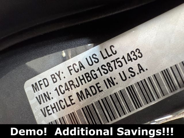 Quick Order Package 22E, 4-Wheel Disc Brakes, 6 Speakers, ABS brakes, Active Noise Control System, Air Conditioning, Alloy wheels, AM/FM radio: SiriusXM with 360L, Anti-whiplash front head restraints, Audio memory, Auto High-beam Headlights, Automatic temperature control, Brake assist, Bumpers: body-color, Capri Leatherette Seats, Compass, Delay-off headlights, Driver door bin, Driver vanity mirror, Dual front impact airbags, Dual front side impact airbags, Electronic Stability Control, Emergency communication system, Four wheel independent suspension, Front anti-roll bar, Front Bucket Seats, Front Center Armrest w/Storage, Front dual zone A/C, Front fog lights, Front reading lights, Fully automatic headlights, Garage door transmitter, Heated door mirrors, Heated front seats, Heated rear seats, Heated steering wheel, Illuminated entry, Knee airbag, Low tire pressure warning, Memory seat, Model Year Tracking, Navigation System, Normal Duty Suspension, Occupant sensing airbag, Outside temperature display, Overhead airbag, Overhead console, Panic alarm, ParkView Rear Back-Up Camera, Passenger door bin, Passenger vanity mirror, Power door mirrors, Power driver seat, Power Liftgate, Power passenger seat, Power steering, Power windows, Radio data system, Radio: Uconnect 5 Nav with 10.1 Display, Rear anti-roll bar, Rear reading lights, Rear window defroster, Rear window wiper, Remote keyless entry, Security system, Speed control, Speed-Sensitive Wipers, Split folding rear seat, Spoiler, Steering wheel mounted audio controls, Tachometer, Telescoping steering wheel, Tilt steering wheel, Traction control, Trip computer, Turn signal indicator mirrors, Variably intermittent wipers, Voltmeter, and Wheels: 18 x 8 Polished/Painted Aluminum.